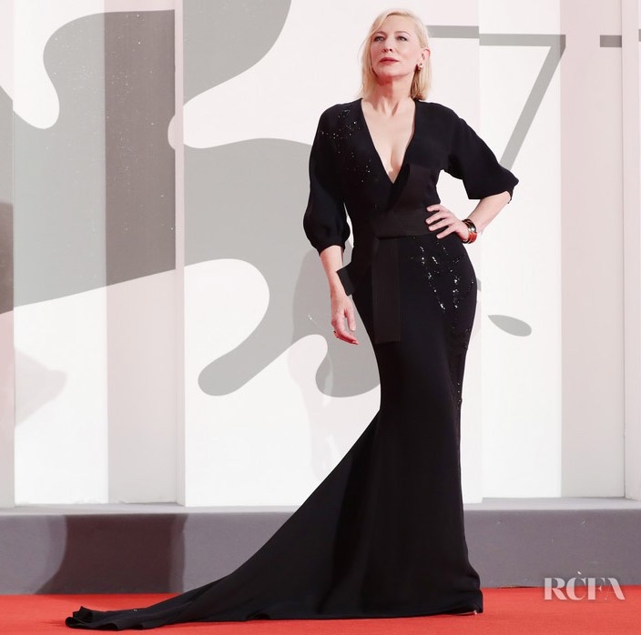 Segue la famosissima Cate Blanchett, attrice australiana, nel suo abito nero con applicazioni di strass e paillettes e fiocco in vita, creazione di Armani Privé. L’abito è adatto all’occasione, semplice, ma al contempo molto d’impatto e raffinato. Fin qui non ci sarebbero problemi se non fosse che è proprio lei la donna riciclatrice di abiti da red carpet (tanto che Greta Thunberg spostati). Infatti la nostra Cate aveva già indossato questo splendido vestito al Festival di Cannes del 2015.